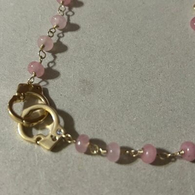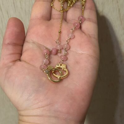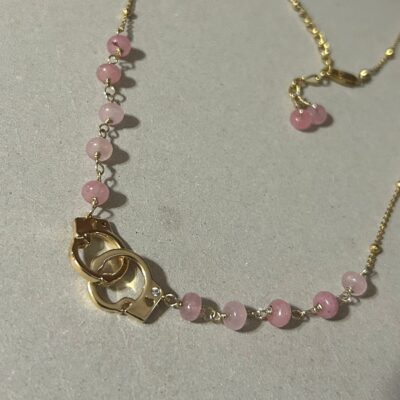 Este collar combina la suavidad del cuarzo ágata rosa claro con un dije de esposas en baño de oro, creando una pieza única que simboliza la conexión, el amor y la libertad. Ideal para quienes buscan una joya que ofrezca estilo y significado en cada detalle.
