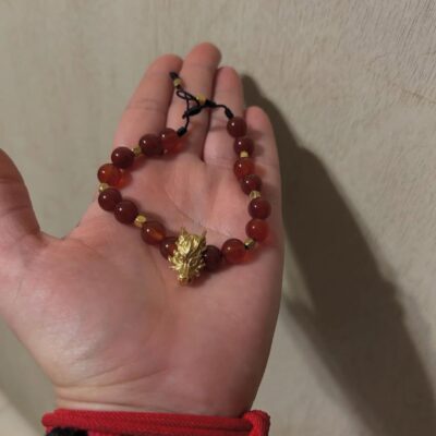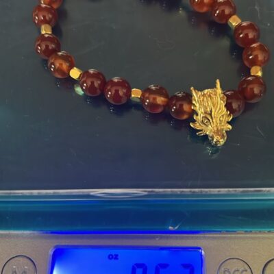 Una joya especial que une la fuerza del cuarzo cornalina con la majestuosidad de un dragón de metal, acompañado de detalles cúbicos en chapa de oro. Confeccionada con hilo italiano para máxima resistencia y acabado refinado, esta pulsera es tanto un accesorio elegante como un amuleto de energía positiva.