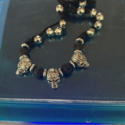 Una pieza única que combina la energía del cuarzo hematita con el carácter imponente de una figura de calavera en metal Pewter. Su diseño incorpora cuentas de 0.6 mm y 0.8 mm, elaborada con hilo italiano que asegura resistencia y durabilidad. Un accesorio que proyecta fuerza, estilo y autenticidad.
