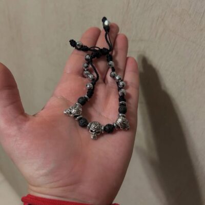 Pulsera de piedra volcánica con calaveras de rodio y micro pavé 💀 Estilo audaz, protección energética y brillo discreto. Dale carácter a tu look. ¡Consíguela ya!