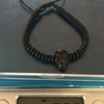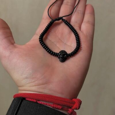 Una pieza elegante y poderosa que une la energía protectora del cuarzo ónix con la intensidad de una figura de calavera en metal rodio. Confeccionada con cuentas de 0.6 mm sobre hilo italiano, esta pulsera destaca por su durabilidad, estilo y carácter único.